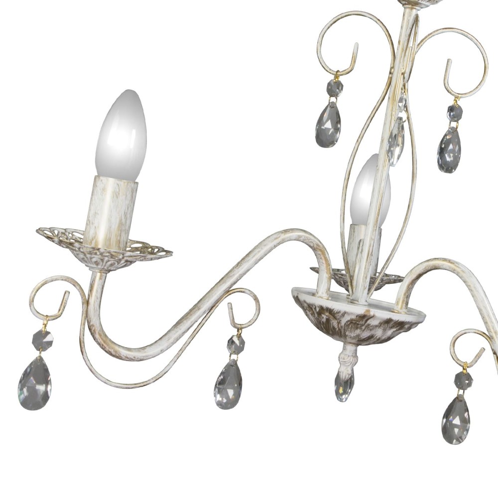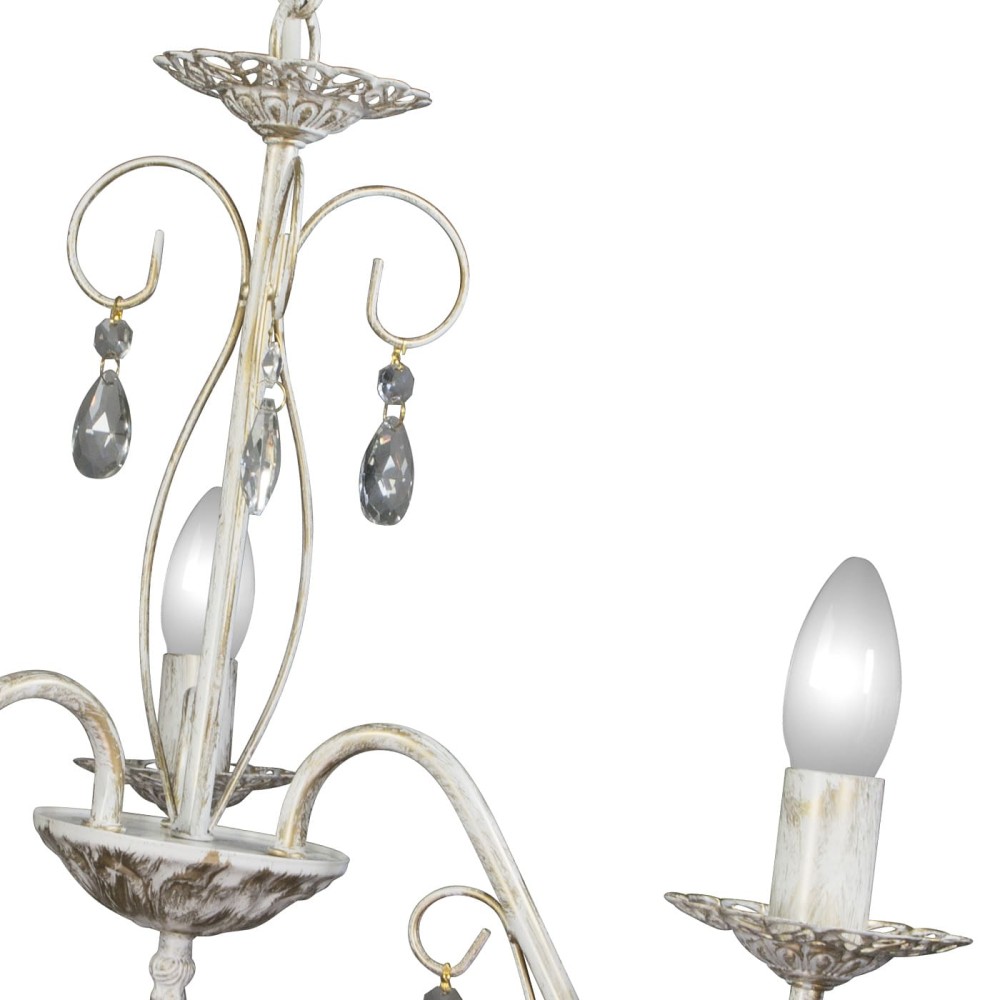 - Роскошный дизайн: Люстра S1152-5 сочетает в себе благородные оттенки белого с патиной золота, что создает ощущение тепла и уюта. Хрустальные подвески, разбросанные по плафону, отражают и рассеивают свет, создавая завораживающий эффект, напоминающий звездное небо. Стиль неоклассики и прованса добавляет светильнику индивидуальности и неповторимого шарма.