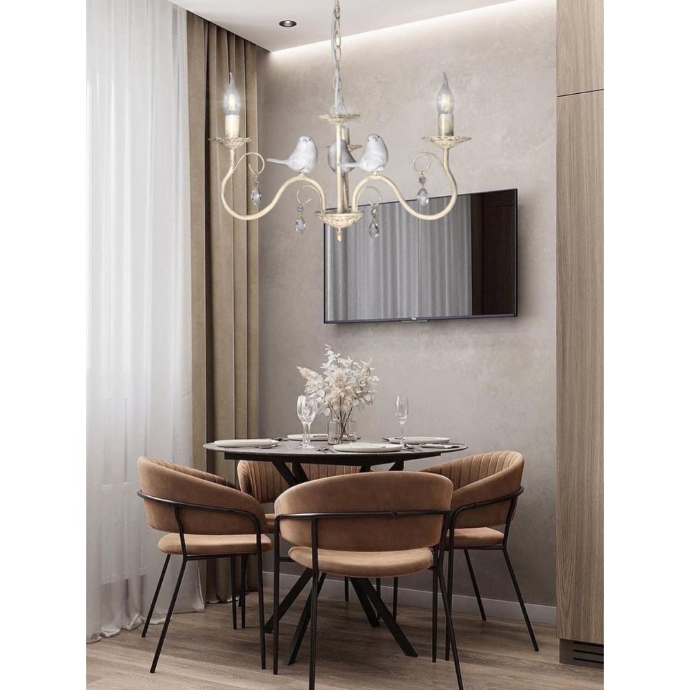 Эта люстра выполнена в нежном бежевом цвете с патиной золота, что придаёт ей утончённый и роскошный вид. Птички и хрустальные подвески добавляют элемент лёгкости и изящества, что делает её идеальным выбором для классических и современных интерьеров.