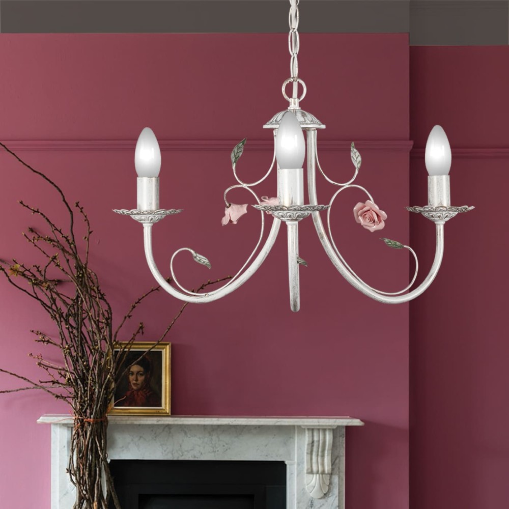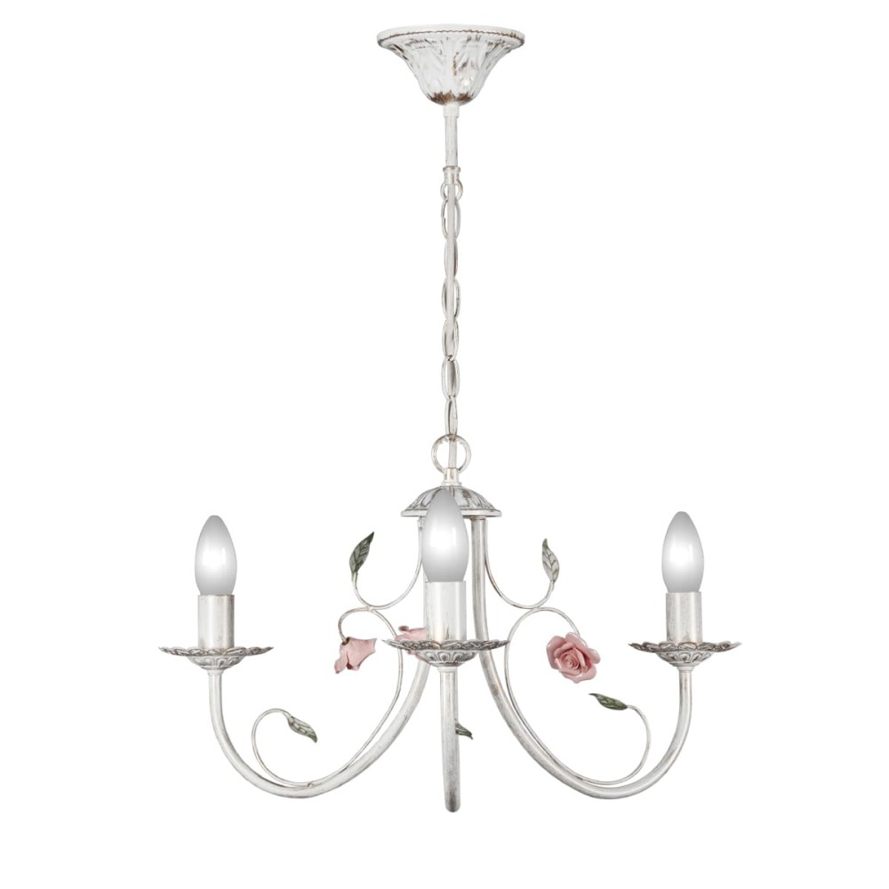 Особенности конструкции: Тип: Подвесная Количество рожков: 3 Тип цоколя: Е14 (макс. 60 Вт) Длина цепи: Цепь можно укоротить до 1 звена на 17 см, что позволяет регулировать высоту подвеса люстры в зависимости от ваших предпочтений и особенностей помещения. Материал арматуры: Металл Цвет: Белый с патиной золота
