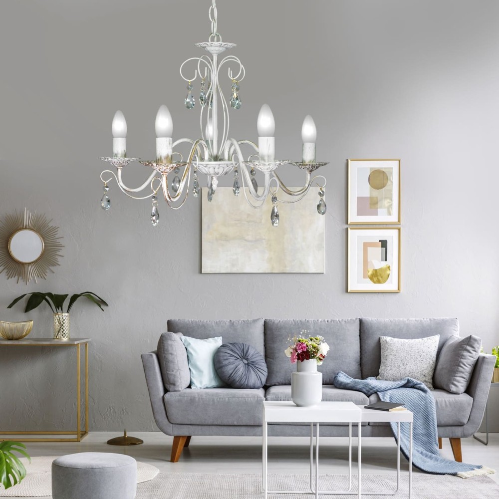 Люстра подвесная цепная свечи Аврора 5 лам дизайнерская Петрасвет производство люстр №1 в России S8066-5, 5хЕ14 макс, 60Вт с хрустальными подвесками, цепь можно укоротить до 1 звена на 17 см, стиль - классика свечи, арматура - металл, цвет светильника- белый с патиной золота, размеры светильника (LxWxH) - 52x52x70, вес - 2 кг, Люстра на 2 включения, Люстра подвесная и для натяжных потолков и освещение 15-20 м2 помещения в зависимости от мощности лампочек Е14, Люстра подвесная цепная 5 рожковая подходит для освещения комнат, Заводсткая гарантия завода Петрасвет 7 лет, Люстра просто собирается по инструкции, Люстры пяти рожковые собраны и проверены на производстве, люстры просто собираются, плотно упакован в коробке из тройного гофра картона, Лампочки светодиодные LED подбираются по следующим параметрам: для яркого освещения - 3 Вт на 1 м2 комнаты, для среднего - 2 Вт на 1 м2, В случае боя или не комплекта, вышлем новый за свой счет в день обращения,